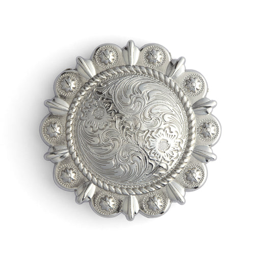 Expensive looking concho at an economy price. Full of detail with an intricately carved appearance, this antique silver plated concho looks great o...