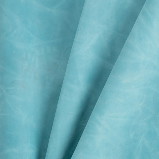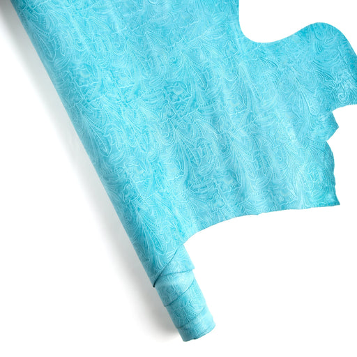 These cowhide sides are drum-dyed turquoise then embossed with a bronze metallic foil pattern. This medium soft leather is made from of American co...