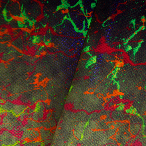This Ultra Violet reactive leather will produce a glow on the paint splashes once exposed to a black light. Tanned in Mexico, these drum-dyed doubl...